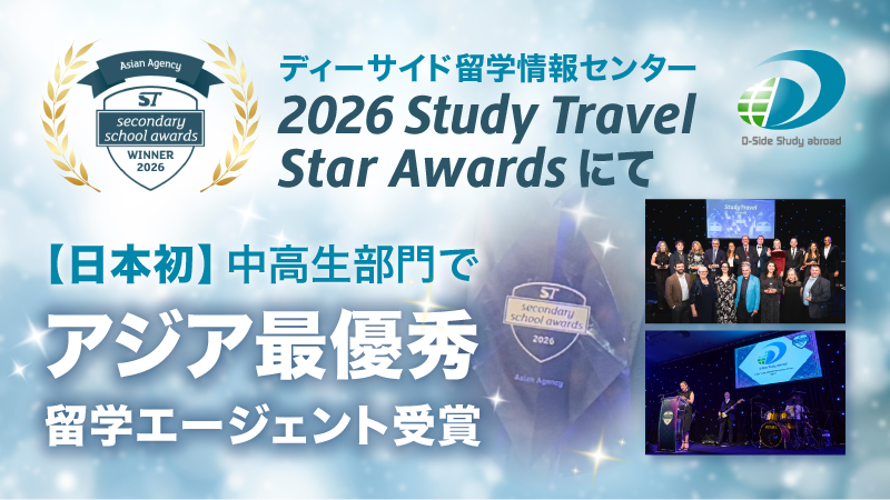 株式会社アットワールド(本社:東京都新宿区、代表取締役社長:上田 顕)が運営する「ディーサイド留学情報センター」は、2026年4月21日(現地時間)、イギリスのStudyTravel社が主催する国際アワード「ST Secondary School Awards 2026」において、アジアエージェント部門(Asian Agency)の大賞(Winner)を受賞いたしました。